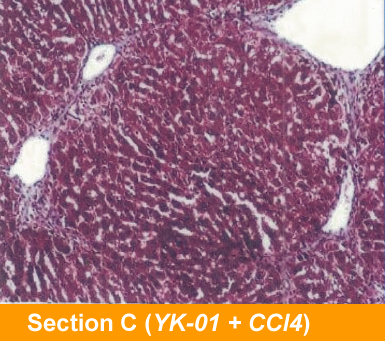 After the rats were given CCl4 orally their livers started to develop observable inflammation and GPT and GOT values were found to be higher than those in the control group. After being fed with CCl4, the two groups receiving ganoderma products (extracted from YK-01 strain) showed significant decrease in GPT and GOT values after three weeks. This shows that ganoderma was able to reduce hepatic injury induced by CCl4. Although the rats were subject to CCl4-induced hepatic inflammation, they experienced less inflammation when fed ganoderma. The efficacy is dose-dependent. i.e, the more the ganoderma (from 0.5g/Kg to 3.0g/Kg) taken, the more the inflammation was alleviated and liver function indices lowered. Thus, in the animal testing model for lowering serum GPT and GOT values, ganoderma extract was shown to have the effect of alleviating hepatic injury.